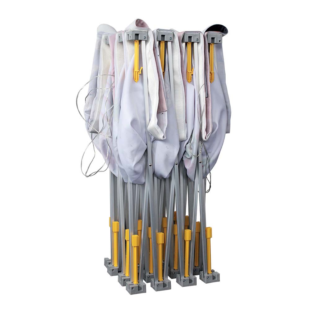 Die Textilfaltwand besteht aus Displaystoff, dieser hat das B1 Zertifikat für schwere Entflammbarkeit nach der in Deutschland geltenden Brandschutznorm. Somit ist er optimal für Innenanwendungen geeignet.
